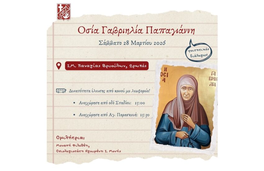 Αυτό το Σάββατο 28/03 η ΧΦΕ επισκέπτεται την Ι.Μονή Παναγίας των Βρυούλων στον Ωρωπό για να συμμετάσχουμε αρχικά τον Εσπερινό και στην συνέχεια να συζητήσουμε με την Ηγουμένη της Ι.Μονής την Μοναχή Φιλοθέη για την νέα Αγία της Εκκλησίας μας, την Οσία Γαβριηλία Παπαγιάννη.