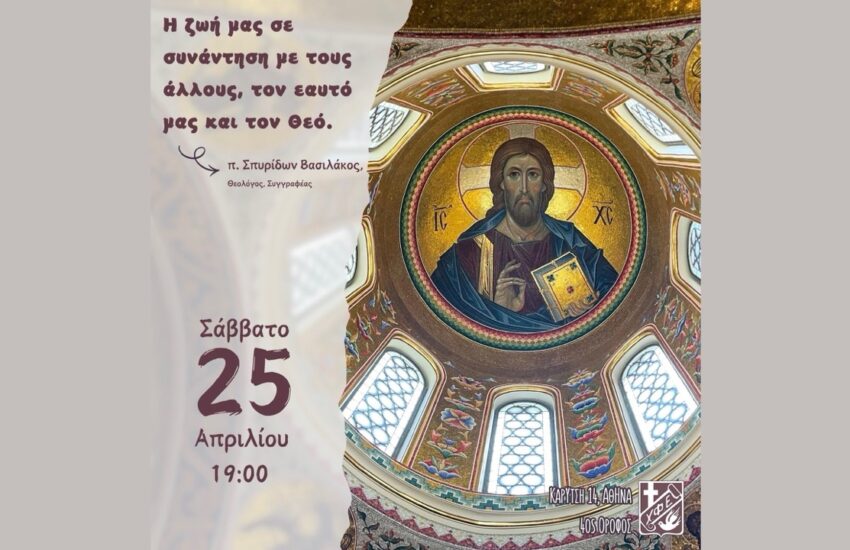 Ομιλητής θα είναι ο π.Σπυρίδων Βασιλάκος (Θεολόγος και συγγραφέας) και το θέμα που θα μας αναπτύξει είναι «Η ζωή μας σε συνάντηση με τους άλλους,τον εαυτό μας και τον Θεό».